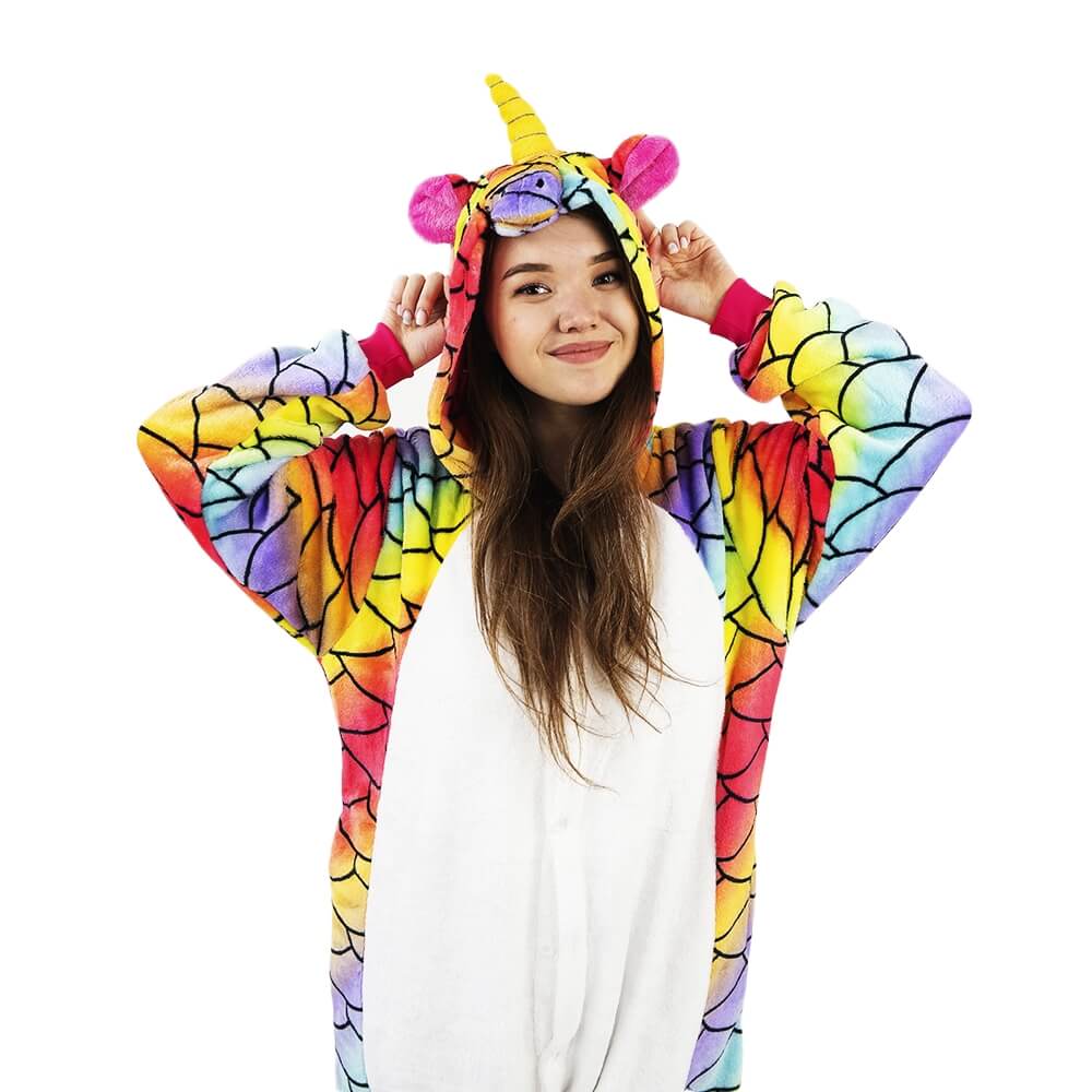 Кигуруми Единорог Хамелеон отличается ярким дизайном и красочной расцветкой. Он сшит из мягкой, с небольшим ворсом ткани, которая практически не мнется. Принт имитирует чешую. Креативное оформление подчеркивается объемным декором: хвостиком сзади, большим рогом и ушками на капюшоне, пушистой розовой гривой. На животе есть белая вставка.