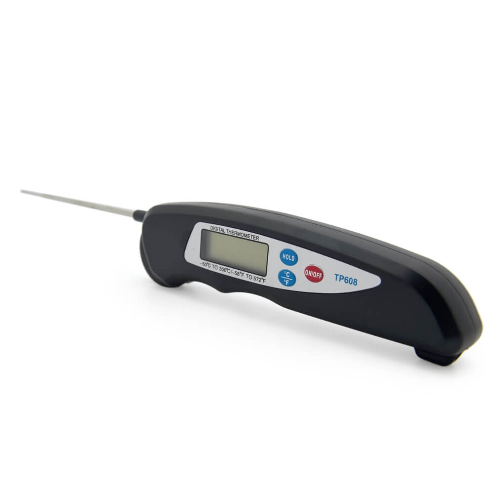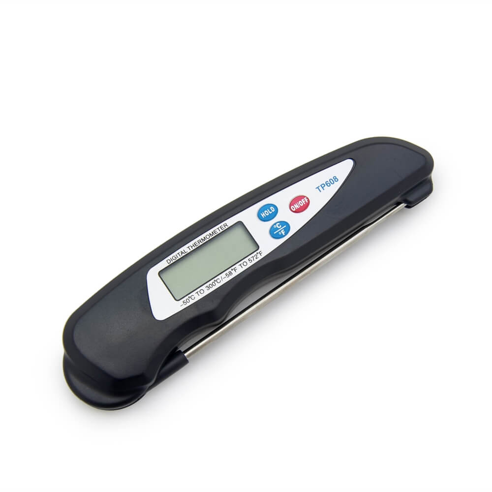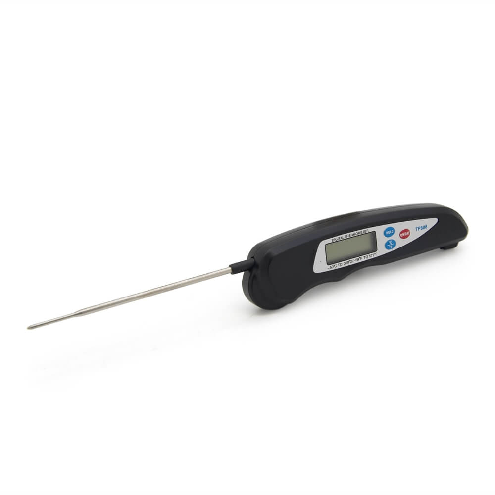Складной кухонный термометр с тонким длинным датчиком из высококачественной нержавеющей стали. Предназначен для измерения температуры приготовленных блюд. Предел измерения термометра - от -50 до 300 градусов. Прибор позволяет выбирать единицы измерения температуры, сохранять на ЖК дисплее последнее измеренное значение. При неиспользовании прибора в течение 50 минут термометр автоматически выключается. Для питания устройства используется один элемент формата ААА.